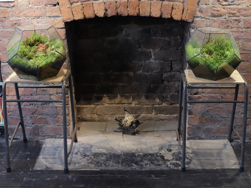 Geodesic glass terrarium, with living peatland mosses and plants, 2025