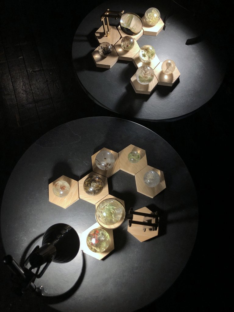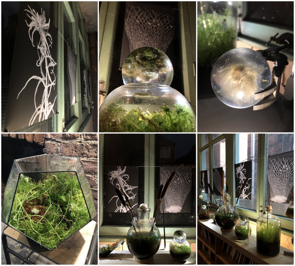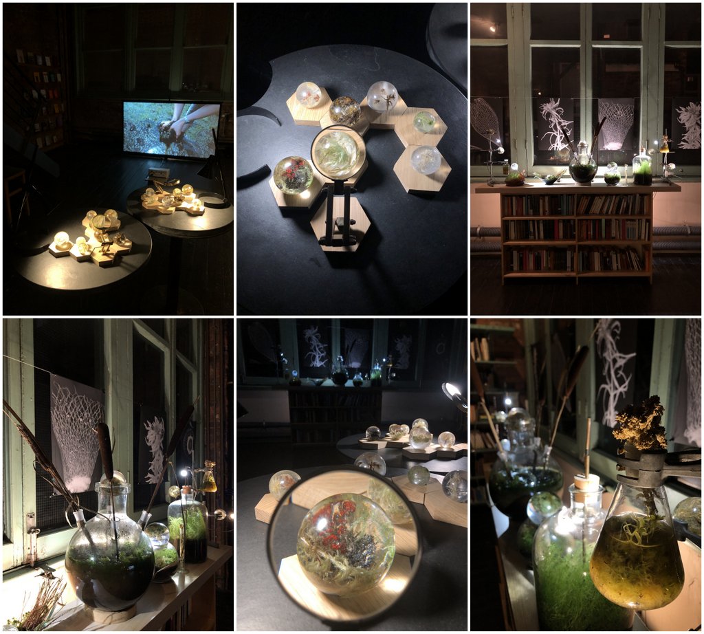 The exhibition also features Accumulations, cast resin spherical sculptures containing suspended examples of sphagnum moss, lichens and plants that thrive in peatland environments; Cultivations, living plant and moss specimens the artist has grown, presented in salvaged laboratory glass vases and terrariums; Observations, photomicrographs, archival prints, photographs and microscope video footage of sphagnum species.