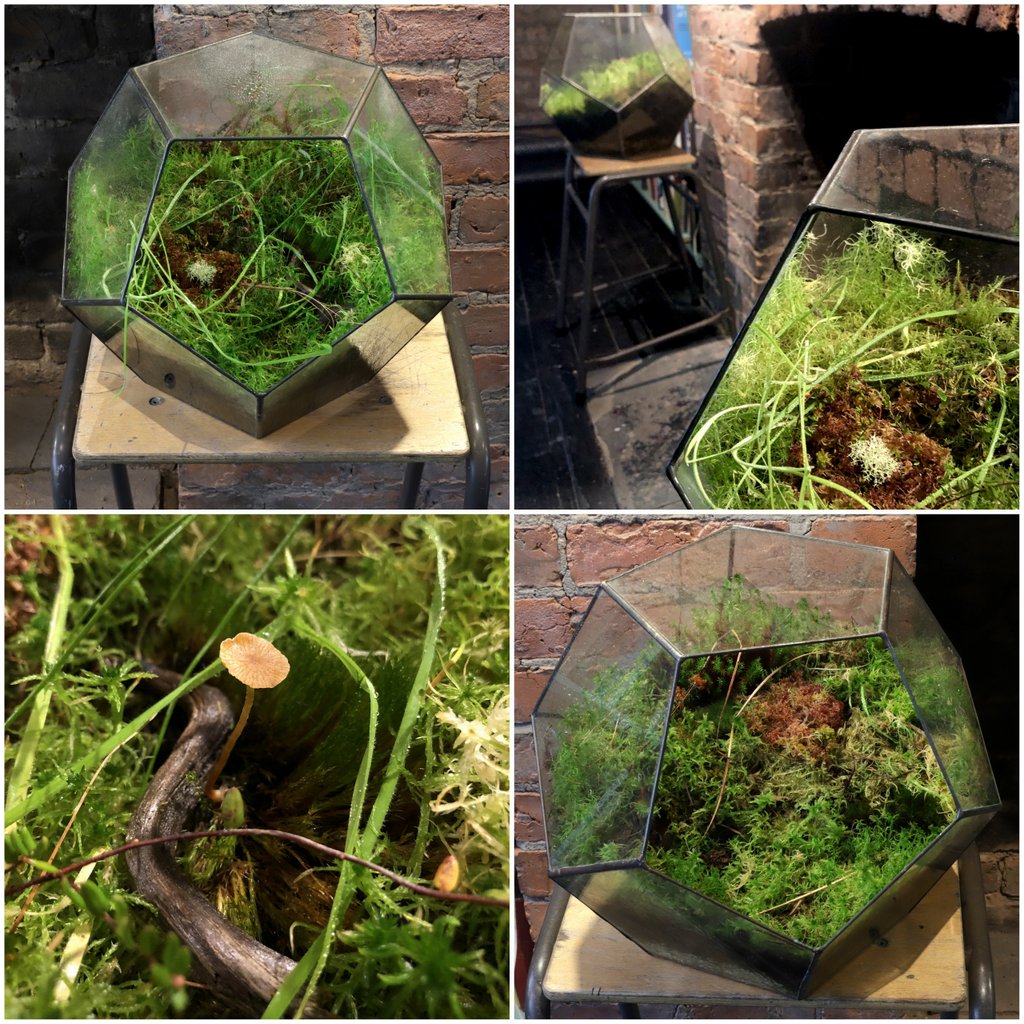 Geodesic glass terrarium, with living peatland mosses and plants, 2025